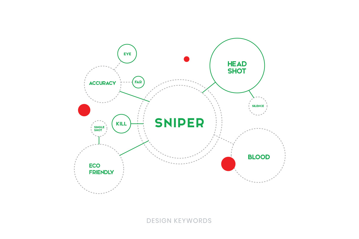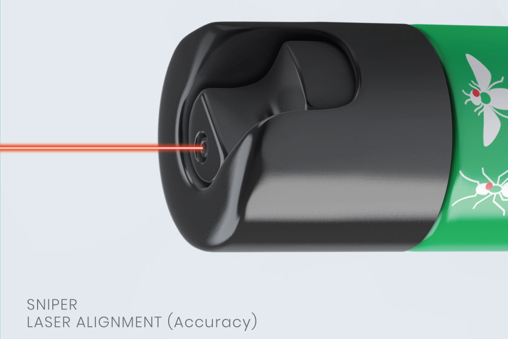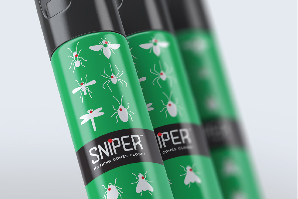 “Sniper is someone who shoots from a hiding place, especially accurately and at long range.” It was enough to base my design idea on it. Inspired by the laser and referring to the accuracy of the Sniper, I considered the red target point as the visual design core. Avoiding the use of actual insect imagery, a set of insects was designed and placed as a pattern on the cans to be different from other competing products and better seen on the shelf
